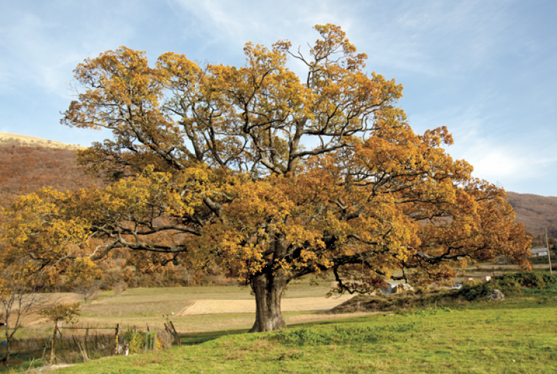 Nonostante la sua veneranda età, ad una stima approssimativa supera i tre secoli, la grande Quercia si mostra ancora nel pieno delle sue forze vitali, con la sterminata cupola di foglie verdissime, il gigantesco tronco sano ed eretto, le enormi branche senza una punta secca. La posizione riparata, il suolo e l`esposizione favorevoli, II rispetto dell`uomo hanno contribuito alla sua perfetta conservazione fino ai giorni nostri. La grande Quercia non è sola, sulla stradetta, sui campi e perfino nel bosco circostante, altri esemplari torreggiano imponenti, pur senza raggiungere la sua eccezionalità.