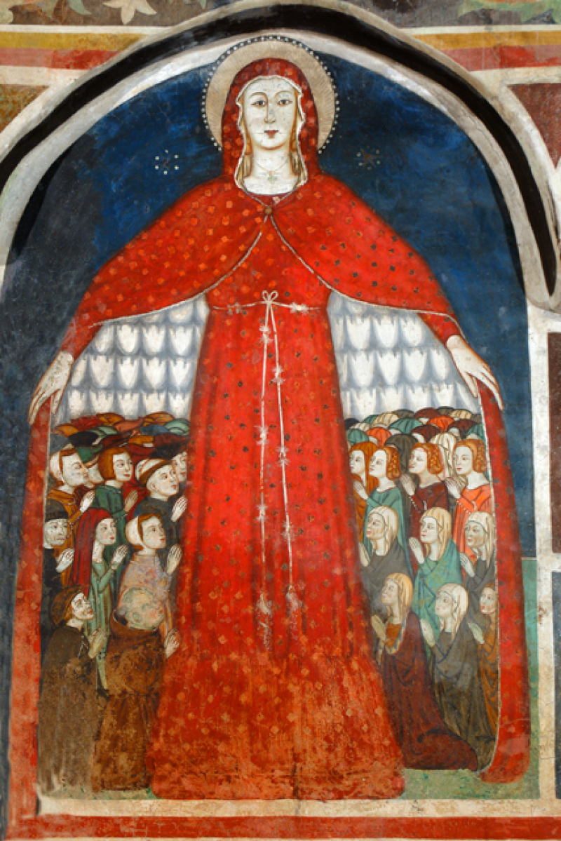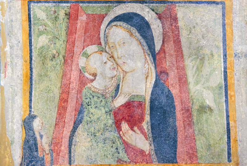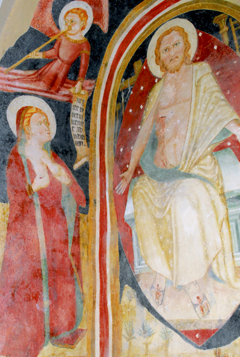 Nel prosieguo della navata, un tempo adibita a cimitero, oggi a “teatrino”, un magnifico arcosolio del Trecento con Madonna in trono e Bambino benedicente tra San Francesco e Santa Margherita regina di Scozia. Dietro, due angeli sostengono una rossa cortina. Nell’antico oratorio, o cappella per le veglie funebri, è conservato in una nicchia un accigliato Cristo Giudice con la croce e gli strumenti della Passione, a sinistra Maria implora clemenza mostrando al figlio il seno che lo allattò e a destra San Giovanni Battista