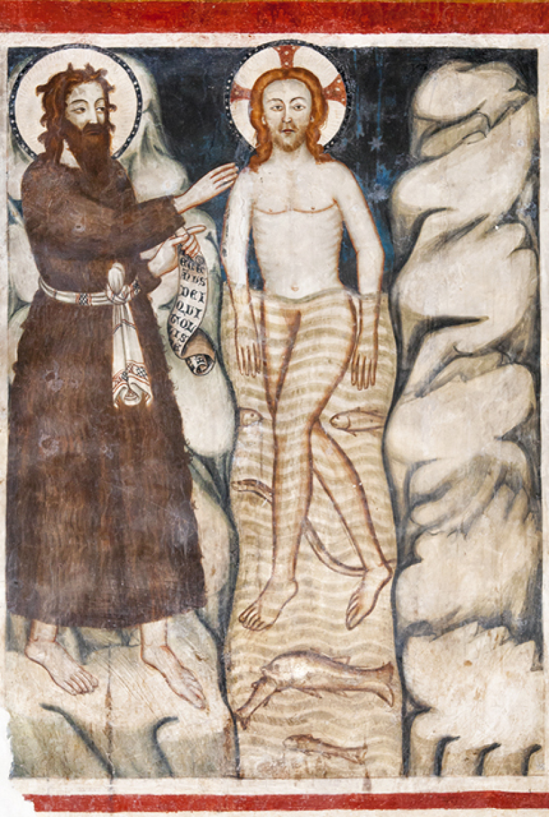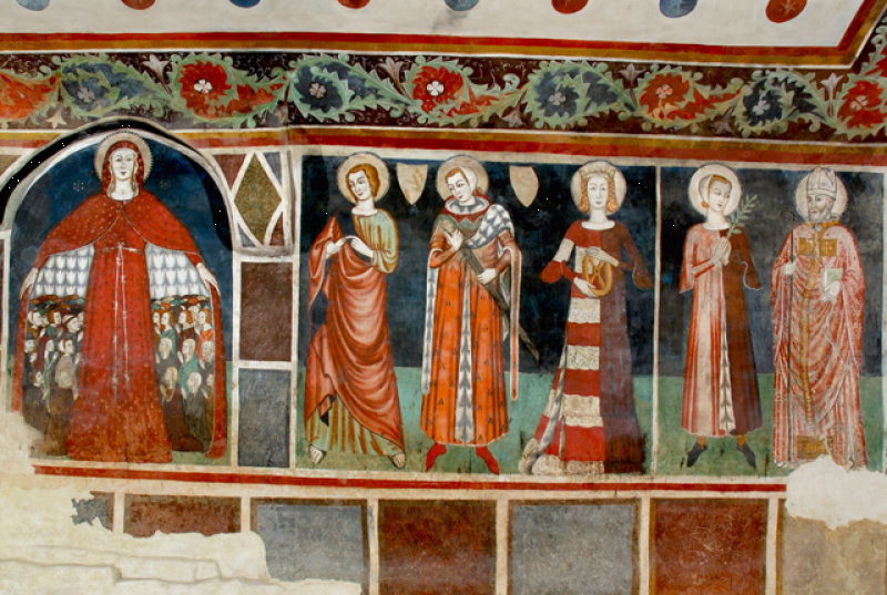 Nella Chiesa inferiore vi sono numerosi affreschi tra cui la Madonna della Misericordia in atto di proteggere sotto il suo manto il popolo del castello accompagnata da una teoria Santi, tra cui Antonio Abate, Martino, Caterina e Agostino. Di notevole interesse artistico è il Battesimo di Gesù nelle acque del Giordano del Trecento