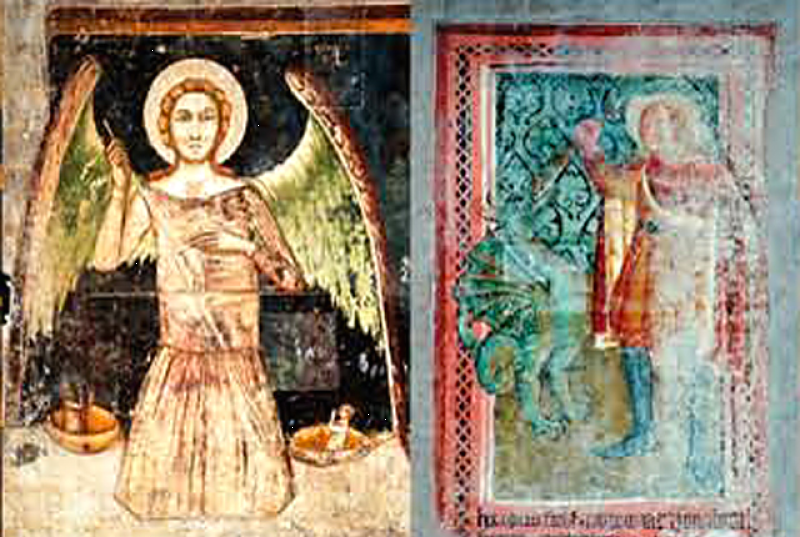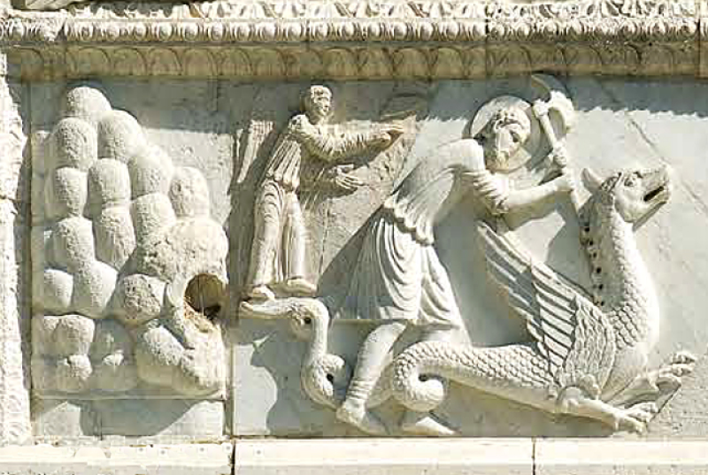 Alle spalle di Mauro che, nel fregio brandisce l’ascia per uccidere il drago, è infatti raffigurato un angelo che benedice l’impresa. Davanti al Santo, un altro angelo protettore assiste all’uccisione del drago insieme ad un terzo Santo, probabilmente Felice. Alle sue spalle un altro Santo è intento a pregare: forse si tratta di una rappresentazione sincronica, raffigurante Mauro che si prepara a compiere l’impresa. Sulla destra del fregio, il celebre miracolo della resurrezione del figlio di una vedova operato da Felice.