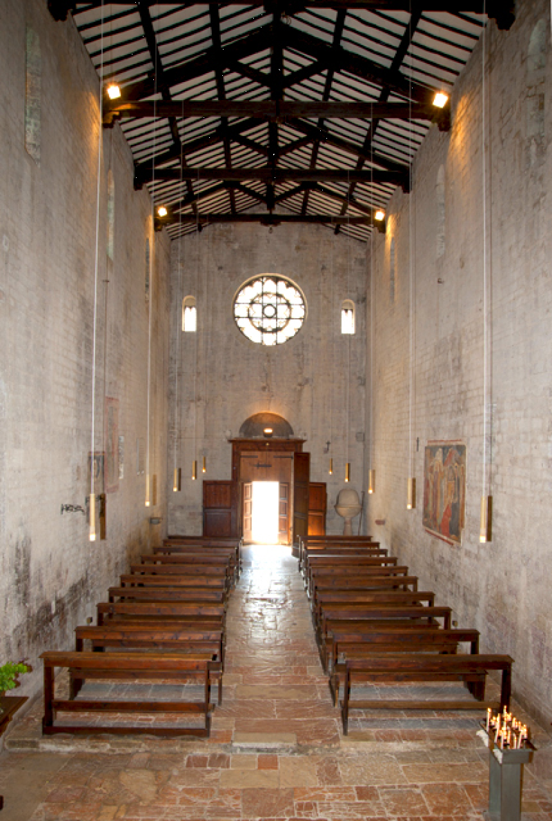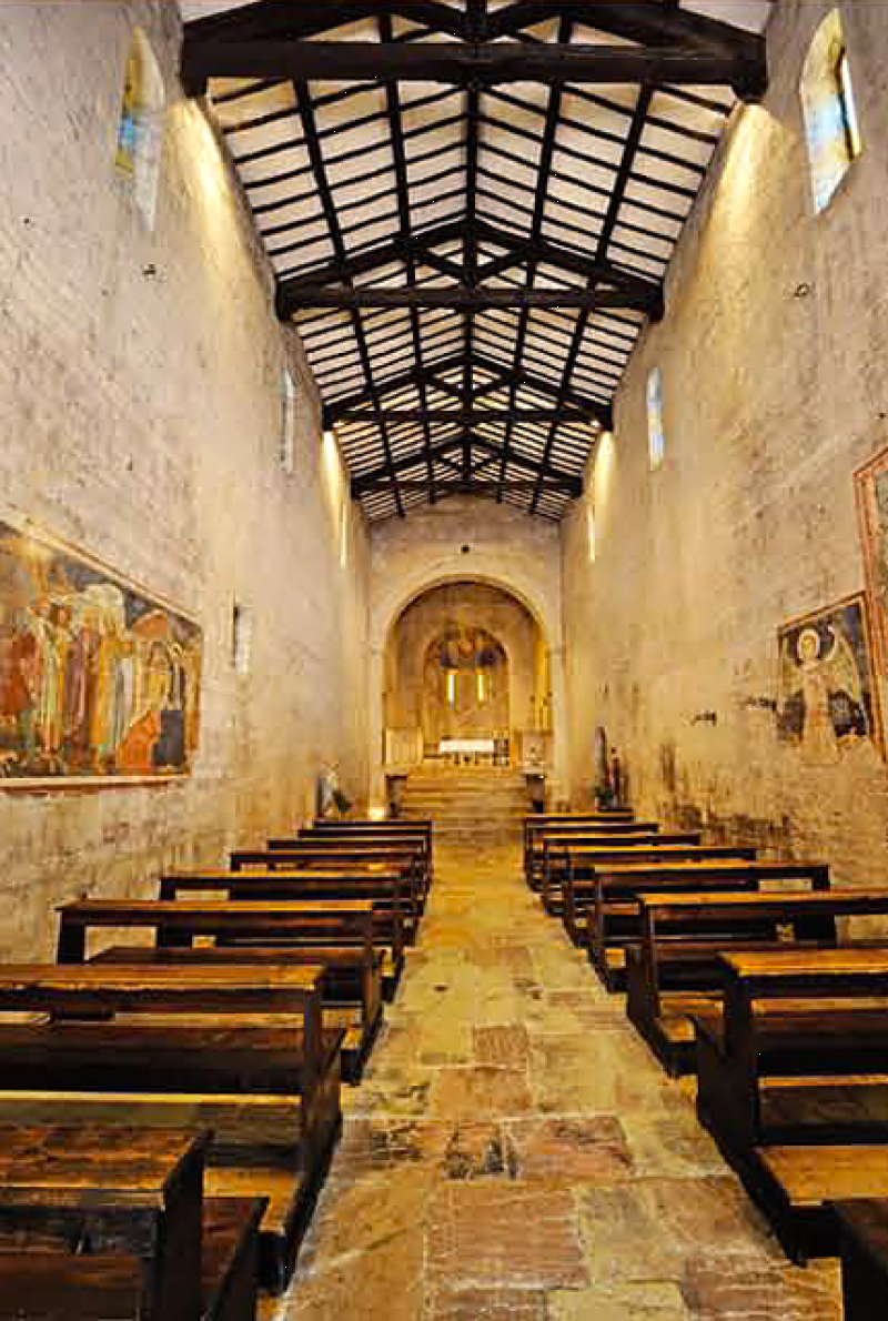 La Chiesa, ad unica navata, è illuminata internamente, dall’alto, da quattro monofore aperte, su ciascuna delle pareti. Il presbiterio, in stile cosmatesco, si innalza al di sopra dello spazio dei fedeli e vi si accede salendo gradini di pietra che, come le virtù, sono sette. L’abside conserva ancora l’antica copertura con lastre di pietra. Cristo benedicente e solenne tra due angeli, nel catino, fu dipinto dal maestro di Eggi alla metà del Quattrocento. Nel tamburo, tra San Sebastiano protettore della peste e Santa Apollonia protettrice dei denti, a Madonna con il Bambino.