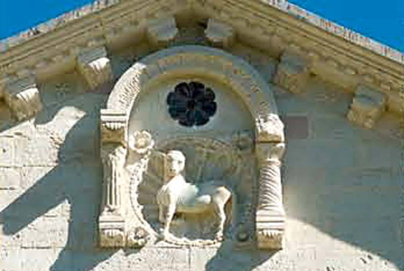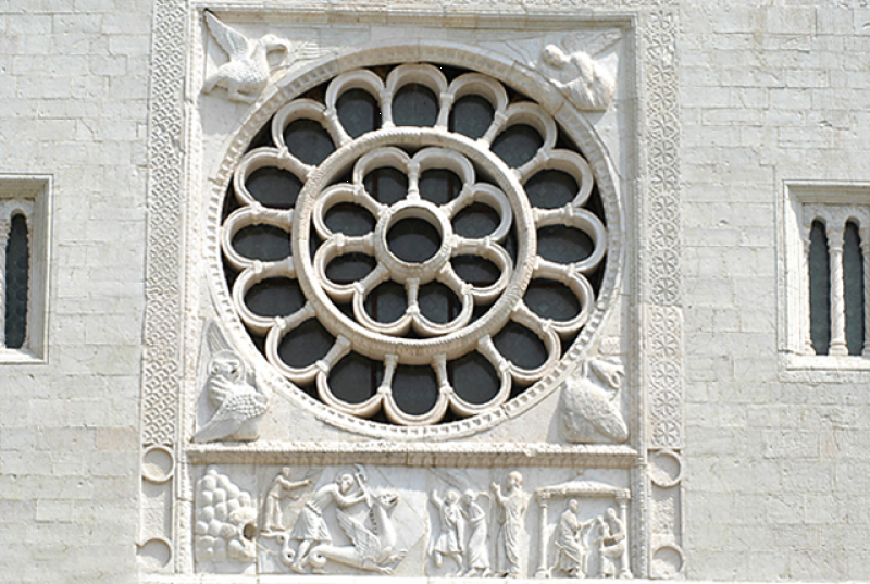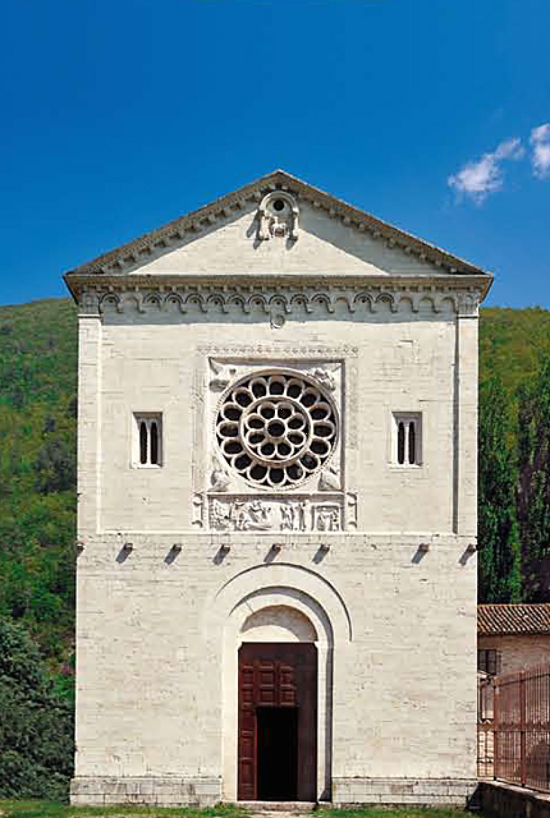 La facciata della Chiesa è suddivisa in tre ordini sovrapposti, al centro del primo, in basso, si apre il portale a doppio incasso. Al centro del secondo ordine, si apre il rosone all’interno di un quadrato ornato negli angoli dai simboli degli evangelisti. Sotto il rosone, il fregio in bassorilievo che racconta l’uccisione del drago. A destra e sinistra del rosone si stagliano due finestre con colonnine tortili. L’elegante timpano poggia su una serie di diciassette archetti e reca, in alto, l’Agnus Dei, inserito in una conchiglia simbolo di rinascita e contrassegno degli insediamenti monastici benedettini. Segno d’amore e di sapienza, una grande rosa di rame al di sopra dell’Agnello.