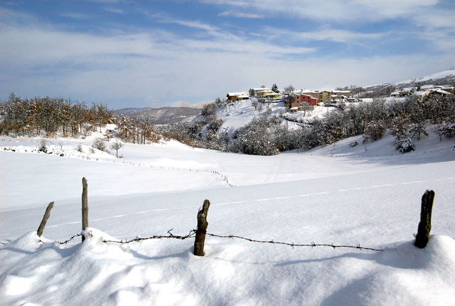 The high ground appears to have been artificially levelled off to form a sort of rectangular platform, with steep, rocky walls forming a natural defence on three sides. A road lined with houses crosses the centre of the platform. The village has two separate nuclei on different levels separated by a saddle.