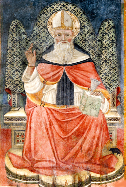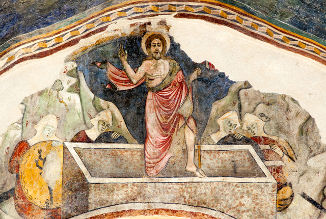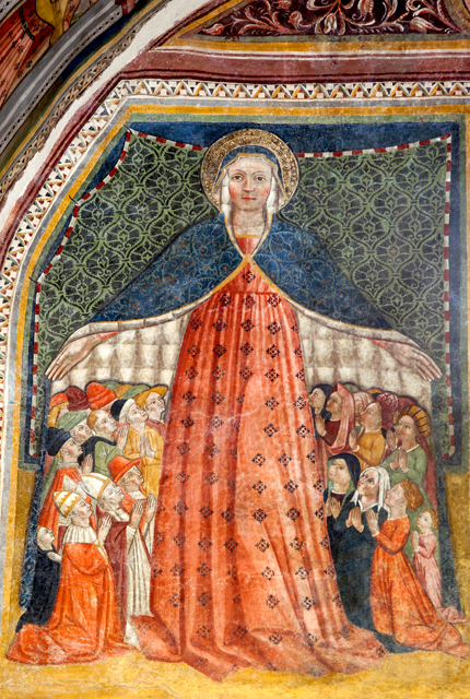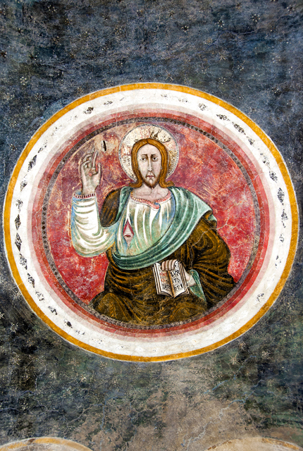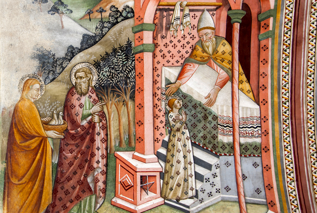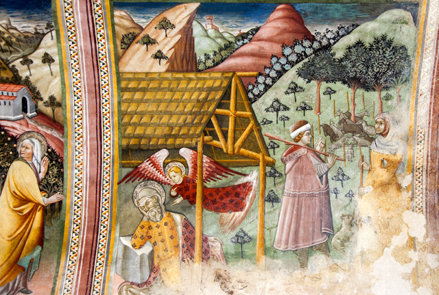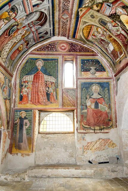 The vault of the central nave used to be painted with six stories of Joachim and Ann and the Virgin Mary, of which four episodes have remained more or less intact. The painter was Giovanni Sparapane, who expresses himself here in a shrill, late Gothic style, which originated from the close geographical and cultural position of Camerino and Foligno, not forgetting his debts to Nicola da Siena. The other images appear to be by a different hand: a gentle woodman, St. Amico, who instead of an axe has a fixed bill hook and holds the rope, with which the lion, who devoured the donkey, was supposed to be tied up; and an energetic St. Anthony, in the role of abbot.