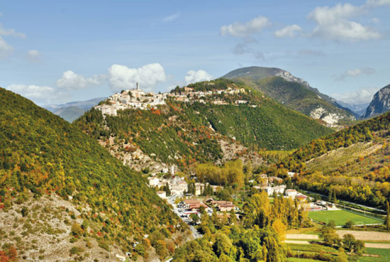 Una facile passeggiata su strada asfaltata, lungo la panoramica Meggianese. Si parte da Macchia, approssimativamente a quota 800 metri, in corrispondenza della Chiesa della Madonna Addolorata, per iniziare il cammino lungo la strada asfaltata alle pendici di Monte Maggiore (1.428 mslm). Il percorso si snoda su strada panoramica, scarsamente frequentata dalle auto, dalla quale si ha una veduta ampia su una bella fetta di Appennino Centrale e su tutta la Valnerina. Superato un vecchio abbeveratoio, posto a destra al di sotto del livello stradale, si giunge al bivio per Piedilacosta e si gira a destra. Raggiunto il piccolo insediamento, lo si attraversa e si ridiscende in direzione di Meggiano. Il paese conserva solo in minima parte le vestigia dell’antico castello di pendio. Da visitare la parrocchiale di San Michele Arcangelo, con all’interno affreschi, esempio di vivida espressività religiosa locale, per la maggior parte dei secoli XVI e XVII. Da Meggiano si riprende la comoda via rappresentata dalla sp 465 per ritornare, dopo circa 3,5 Km a Macchia. Ivi si consiglia di visitare la piccola Chiesa della Madonna Addolorata, costruita in epoca seicentesca, con lo stile di una cappella di transito, con piccolo portale, finestrelle ai lati e campaniletto a vela.