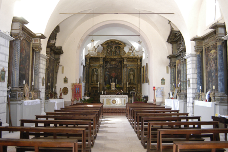 La chiesa, costruita con pianta ad modum crucis, racchiude affreschi del ‘400-‘500. Tra le tele, una Deposizione di ottima fattura della scuola di Daniele da Volterra.