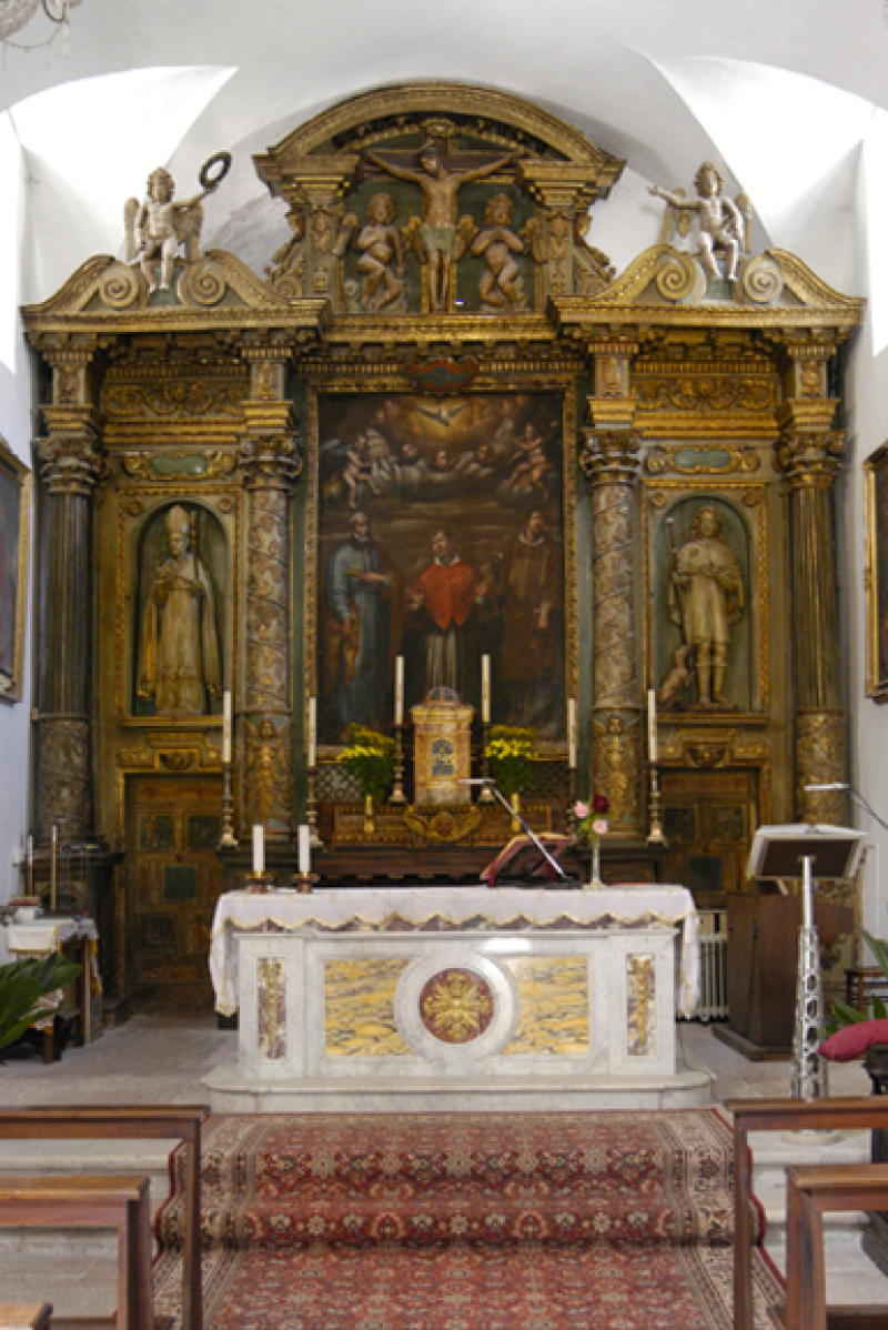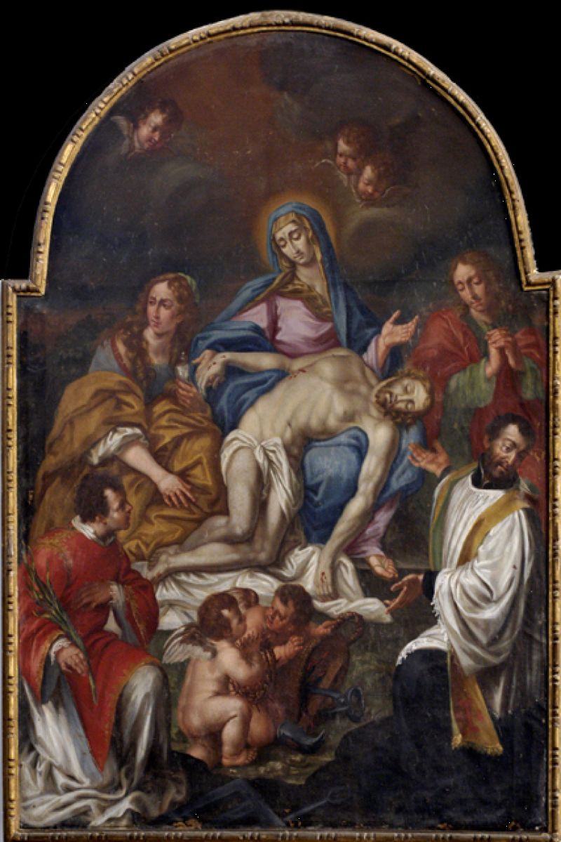 Nell’abside, tela della Deposizione proveniente dalla chiesa proveniente dall’antica chiesa rupestre extra-moenia di Santa Filomena, oggi in rovina. Le autorità ecclesiastiche diffusero su vasta scala il culto al Borromeo per imporre il “nuovo corso” della Controriforma inaugurato dal Concilio di Trento di cui il santo va annoverato tra i principali ideologi.