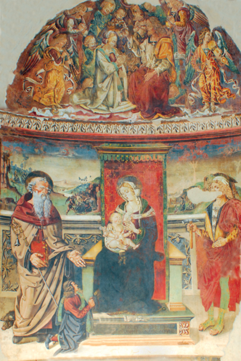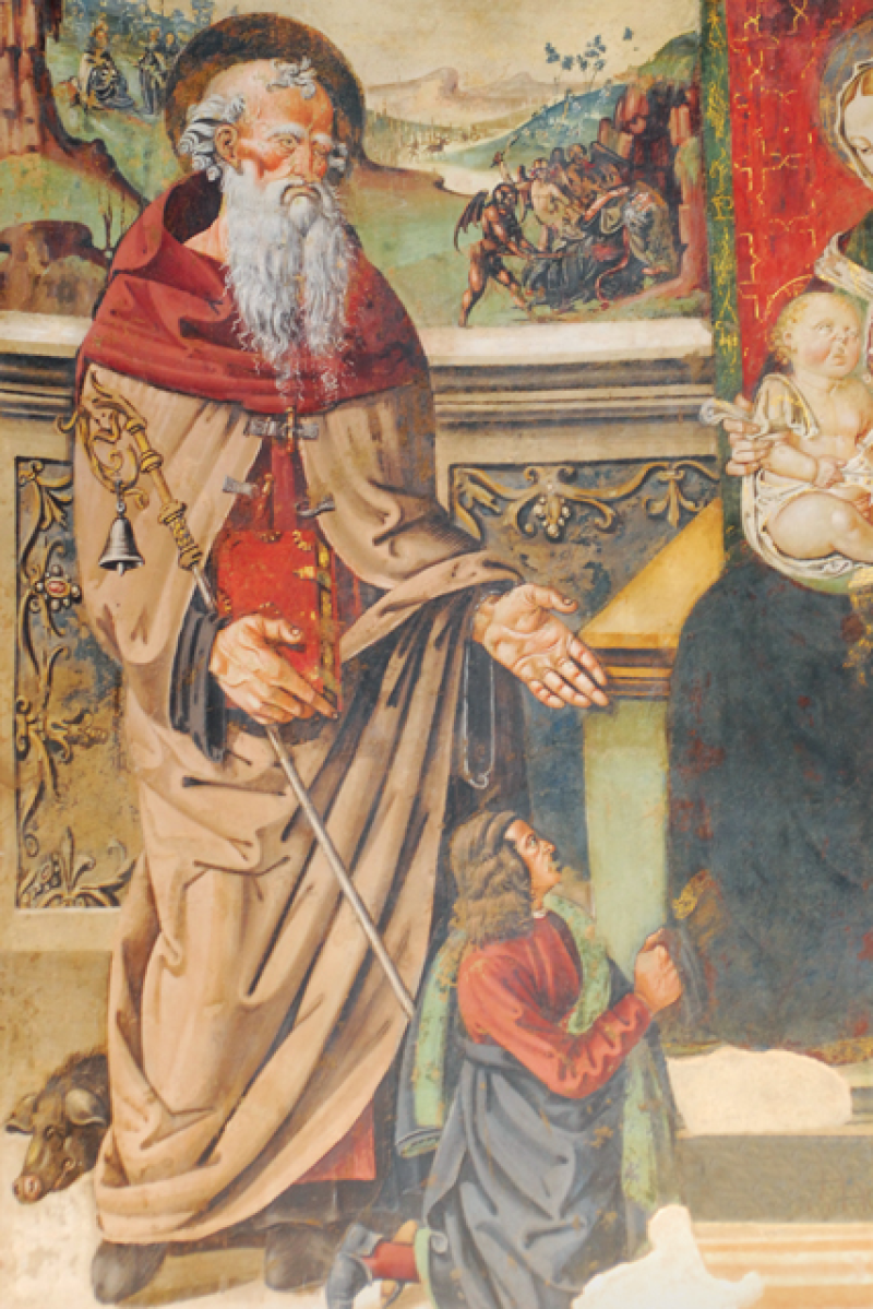 Seguendo il circuito murario, dopo Porta Palatina si arriva alla Chiesa del Crocifisso, ex-priorato dell’ordine ospedaliero di Santo Spirito, ricostruita nel ‘700 e, per Via delle Vergini, si perviene alla Chiesa di Sant’Antonio Abate, addossata alle mura, con annesso monastero femminile benedettino di cui si ha notizia almeno dal ‘300. Per secoli, dinanzi a questa chiesa, il 17 di gennaio festa del santo, venivano benedetti gli animali e il bestiame tra cui i muli della locale corporazione dei “mulari” (societas mulionum). Il campanile del ‘700 sovrasta la cinta muraria.