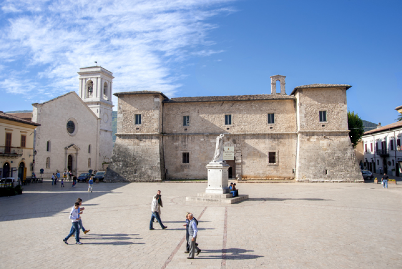 La Chiesa di San Benedetto, basilica dal 1966, fu eretta verso la fine del ‘300 sopra un oratorio paleocristiano insediato in un edificio romano del sec. I. Qui, secondo una tradizione risalente al sec. IX, nel 480 sarebbero nati i fratres gemini Benedetto e Scolastica. La chiesa e l’annesso monastero dipendevano dall’Abbazia di Sant’Eutizio di Preci.