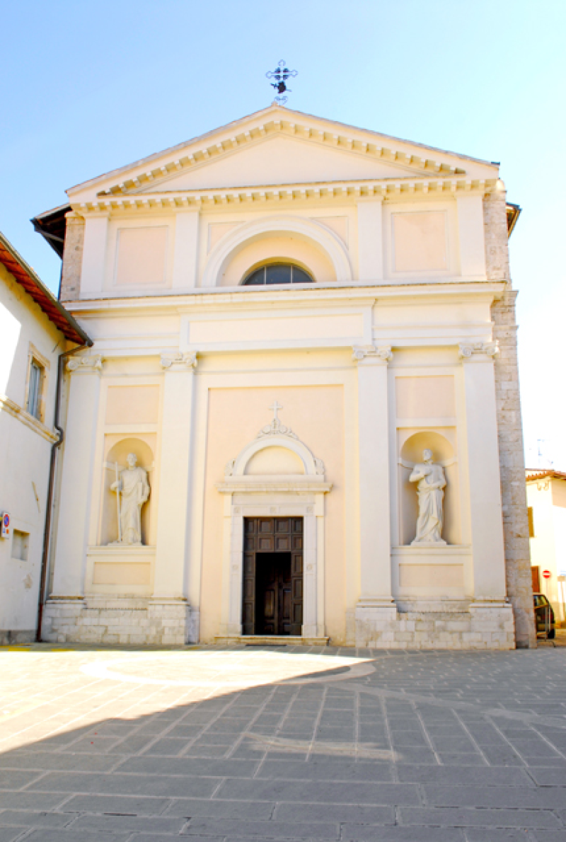 Nella cripta, una absidiola con affreschi del ‘300 ricorda il luogo in cui avrebbero visto la luce i due santi fratelli, Benedetto e Scolastica. Lo slanciato campanile gotico, lesionato dal terremoto del 1703, fu demolito e sostituito da una torre più bassa. Verso il 1570 fu addossato alla parete esterna della chiesa il Portico delle Misure dove si teneva il mercato delle granaglie trasportandovi le unità di misura per cereali prima custodite nel Palazzo del Podestà.