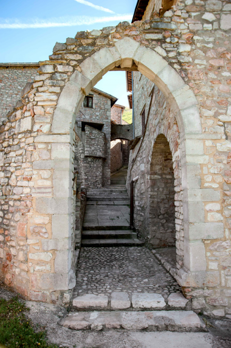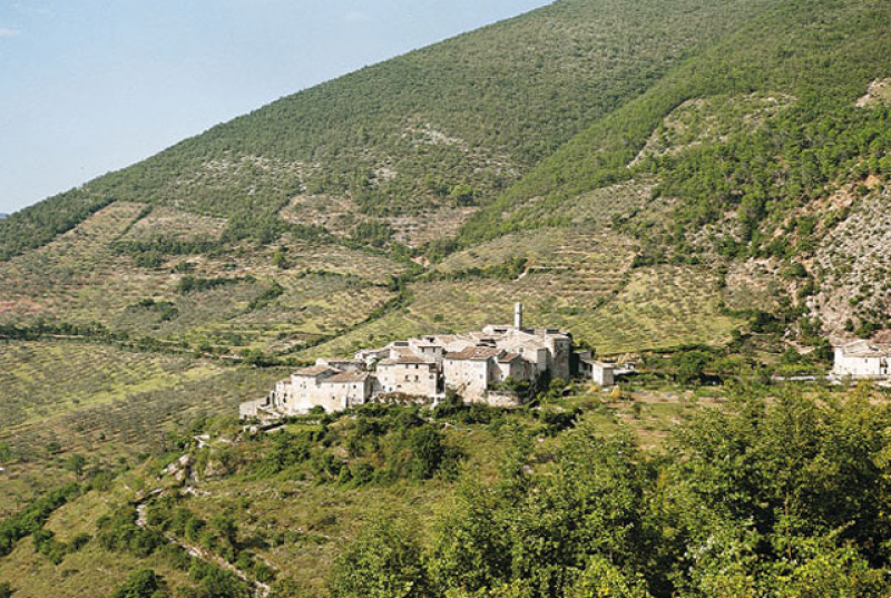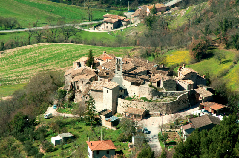 Civitella, nel Comune di Scheggino, si presenta come un castello ellittico di pendio, cinto da mura ben conservate nella parte esposta a sud, lungo uno dei percorsi montani minori che collegavano la Valle del Fiume Nera con il territorio di Monteleone di Spoleto. Questo percorso è testimoniato anche dall`esistenza, a partire dal tardo medioevo, di un pellegrinaio chiamato Hospitaìe S. Crucis che sorgeva nei pressi di Civitella e che la tradizione identifica invece con un edificio con portale architravato e scolpito, accanto alla parrocchiale.