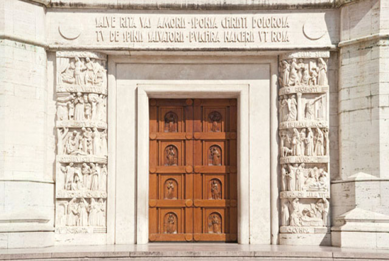 La Basilica di Santa Rita ha uno schema architettonico a croce greca absidata sormontata da una cupola ottagonale. Di maestosa bellezza la facciata compresa tra due alte torri, anch’esse ottagone, terminanti in cuspidi rivestite di rame. Il fregio accoglie i pellegrini recitando: “Salve Rita, colma d’amore, sposa di Cristo dolorosa, tu dalle spine del Salvatore bella nascesti come rosa”. Il portale d’ingresso, composto da due pilastri, venne scolpito da Eros Pellini con l’intento di raccontare tramite dieci pannelli la vita della Santa. L’impatto visivo che la facciata dona ai visitatori è di straordinaria importanza sia religiosa che artistica.