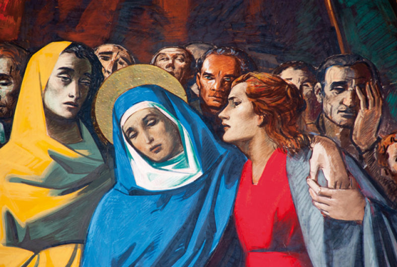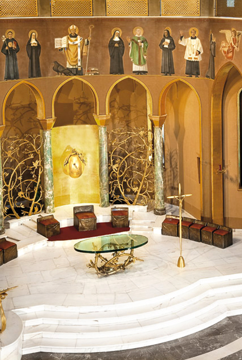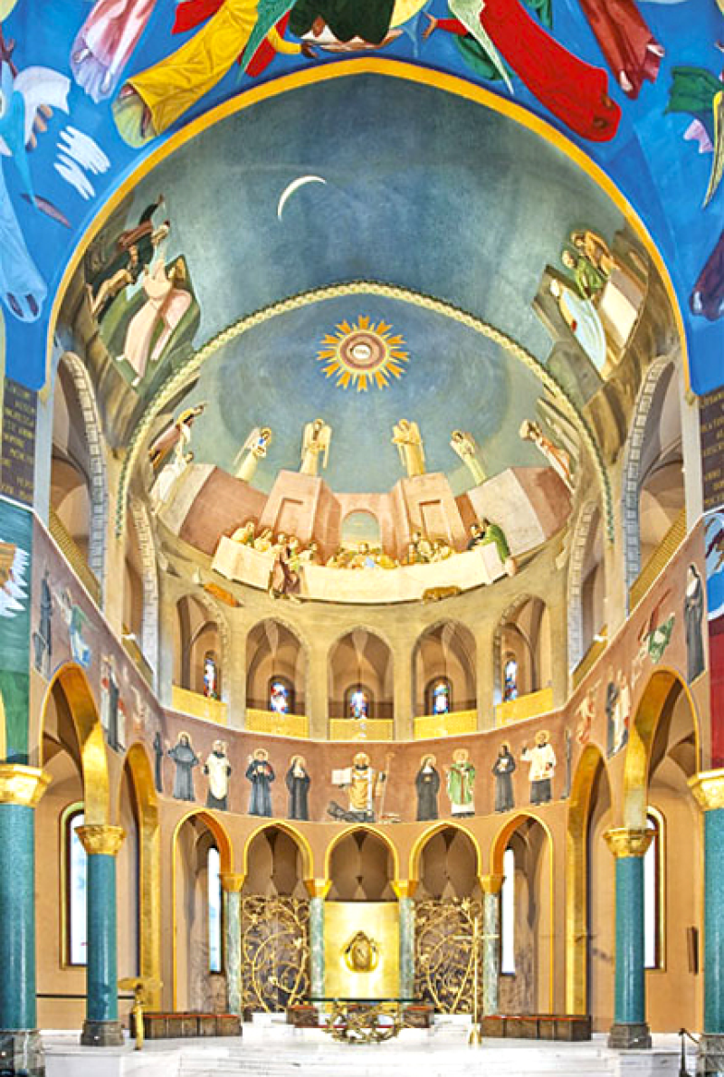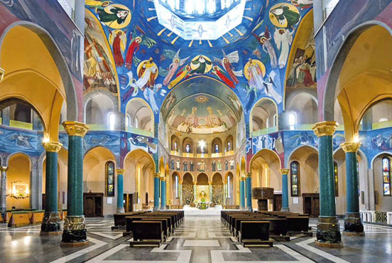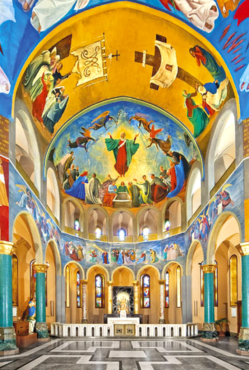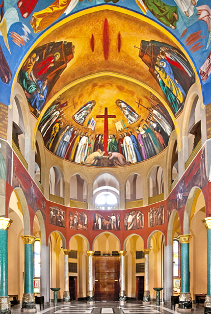 Una volta varcato il solenne portone in legno scolpito, si accede alla prima abside, affrescata da Silvio Consadori (1956) che mette in scena la vita di Cristo. L’abside di destra, opera di Gisberto Ceracchini (1953), narra le scene della vita di Maria che si susseguono fino a culminare, sulla volta, con il grande affresco dell’Assunzione in cui la Vergine ascende al cielo tra un coro di angeli che protendono bianchi gigli. Sulla volta dell’abside di fondo si può ammirare l’ultima cena, dipinta da Luigi Filocamo (1950), dedicata al Santissimo. Rilevante importanza assume il presbiterio, realizzato da Giacomo Manzù (1981) in cui dominano i motivi della riconciliazione, della pace e del perdono, ideali a cui Rita dedicò tutta la sua vita.