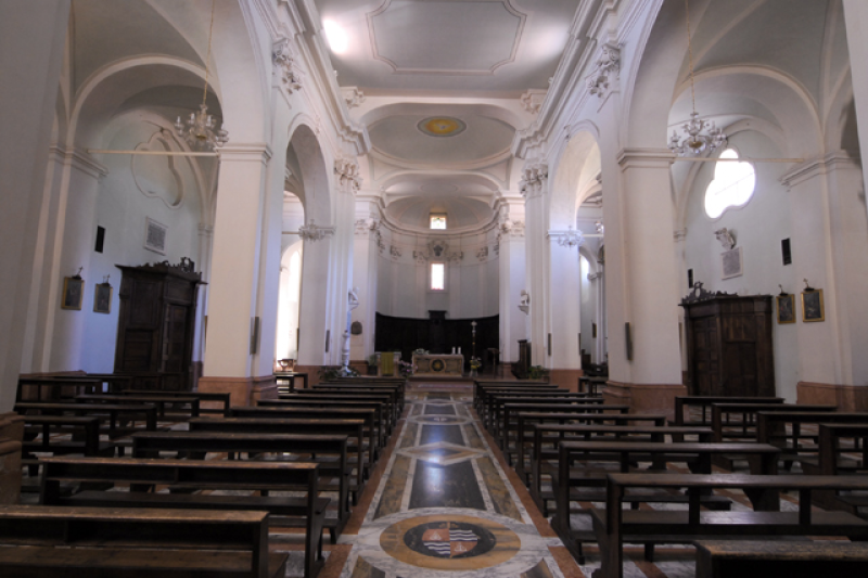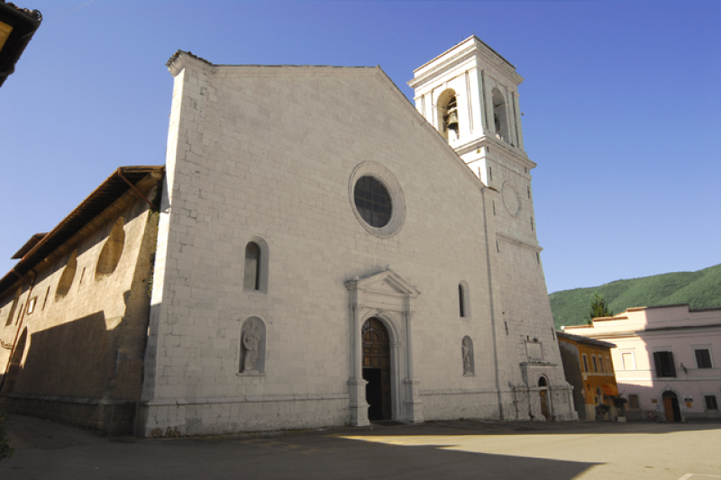 Il robusto campanile a pianta quadrata risale al 1869. L’impianto basilicale monoabsidato è suddiviso in tre navate. Di aspetto settecentesco conserva altari decorati da interessanti tele. Nel primo altare a destra è collocata la tela del pittore siciliano Giuseppe Paladini con San Vincenzo Ferrer e gli infermi (1756). Il secondo altare è decorato da Madonna e santi, tela di Cristoforo Roncalli detto il Pomarancio (inizi del XVII secolo). A sinistra del presbiterio, la cappella della Madonna della Misericordia realizzata da Francesco Duquesnoy intorno al 1640. L’altare fu commissionato da Giacinto Senzasono, prelato nursino vicino al cardinale Ascanio Filomarino. Duquesnoy eseguì per il cardinale la decorazione della cappella omonima nella chiesa dei Santi Apostoli a Napoli. Al centro si trova un affresco miracoloso raffigurante la Madonna col Bambino, San Benedetto e Santa Scolastica produzione della bottega degli Sparapane (1528), che originariamente si trovava nei pressi di porta Maccarone, e che il 2 giugno 1641 venne portato per meglio conservarlo all’interno della Cattedrale.