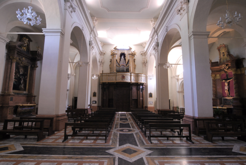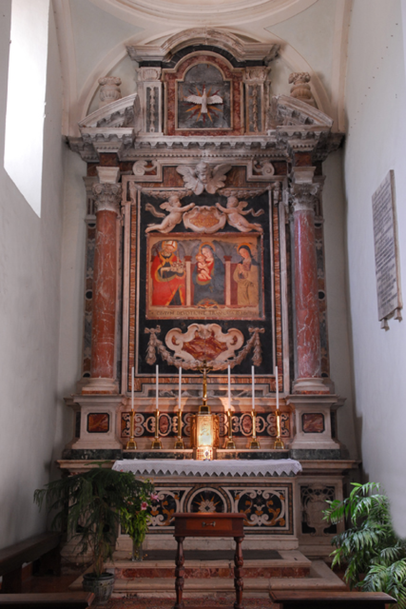 La semplice facciata, con tetto a capanna, è decorata da un elegante portale sormontato da un timpano e fornito di battenti datati 1576. Degna di nota è la particolare soluzione antisismica del lato sinistro, realizzata in seguito ai terremoti del 1703 e del 1730. Tentativo di raccordo tra il muro a scarpata e il laterale portale gotico, proveniente dalla pieve abbattuta.