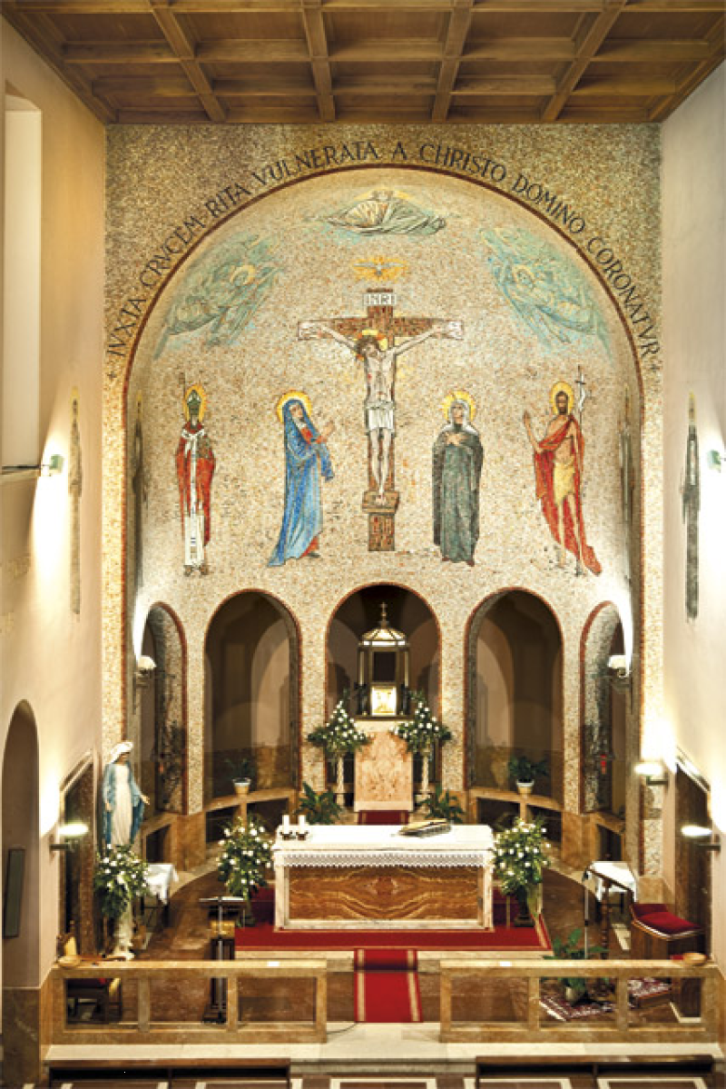 Sulla sinistra, prima dell’abside, la figura di San Francesco. Un ulteriore scritta in mosaico corre sull’arco dell’abside: Iuxta crucem Rita vulnerata a Christo Domino coronatur.