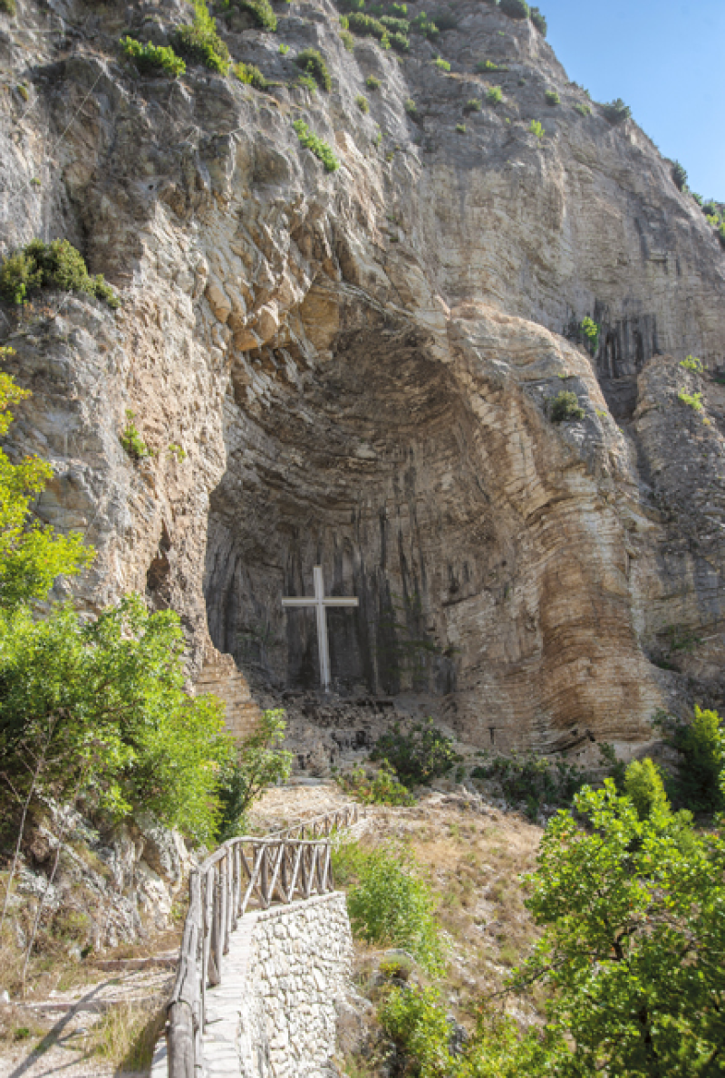 Non c’è oscurità nell’antro, né luce soverchia: vi regna una trasparente, tenue penombra protetta dall’abbraccio delle pareti possenti. Sulla sinistra dell’entrata, una grotta più piccola, poco profonda: quasi una nicchia. Alle due estremità della grotticella, due coppelle scavate nel pavimento roccioso, rivelano che quel luogo, al pari dello Scoglio, dovette essere sede di culti ancestrali.