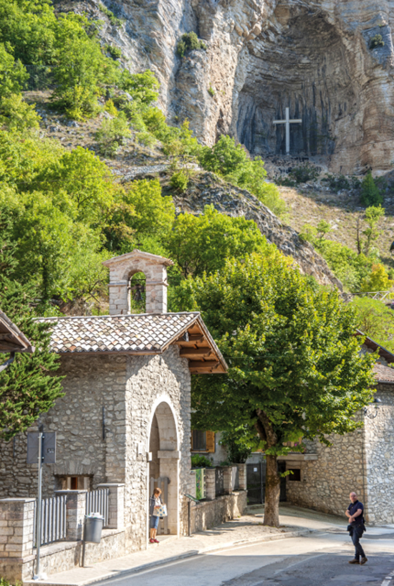 L’antro è poco profondo e assai spazioso. Nell’entrata, che descrive un maestoso arco a sesto acuto, è inquadrato, sulla sinistra, lo Scoglio Sacro che, nel lato prospiciente l’antro, strapiomba con le sue rocce nude e biancastre spiccanti sul verde cupo dei boschi. In alto, dietro lo Scoglio, si scorgono i tetti del borgo di Capanne di Roccaporena. Verso destra, una cinquantina di metri più in basso, le case di Roccaporena, borgo natale di Santa Rita.