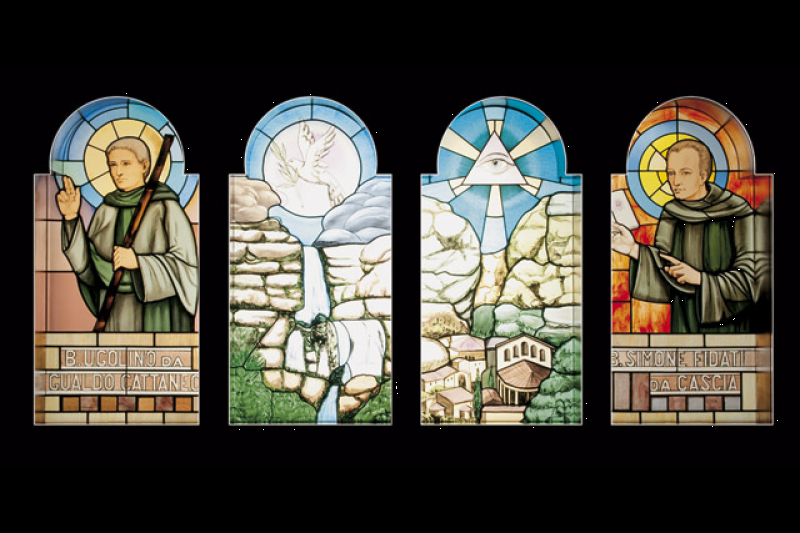 Sulla verticale del centro della Basilica Inferiore, in alto, convergono quattro volte verso una grande croce dipinta sulla vetrata della lanterna. Intorno a quest’ultima vetrate che rappresentano figure di beati agostiniani. Eros Pellini scolpì il paliotto raffigurante l’ultima cena al di sotto dell’altare maggiore.