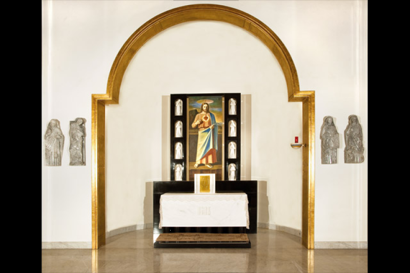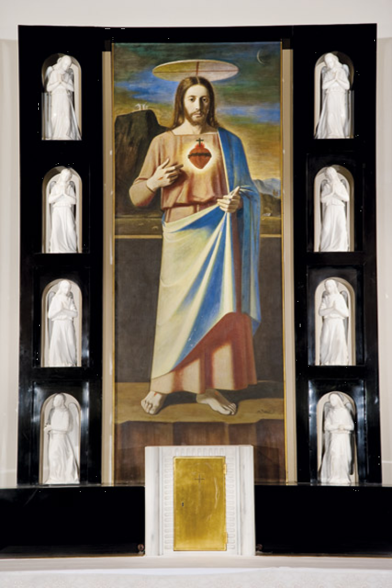 Sopra di esso si erge la grande figura del Sacro Cuore di Gesù, dipinta da Filocamo.Armando Marrocco è anche l’autore del crocifisso posto nel presbiterio.