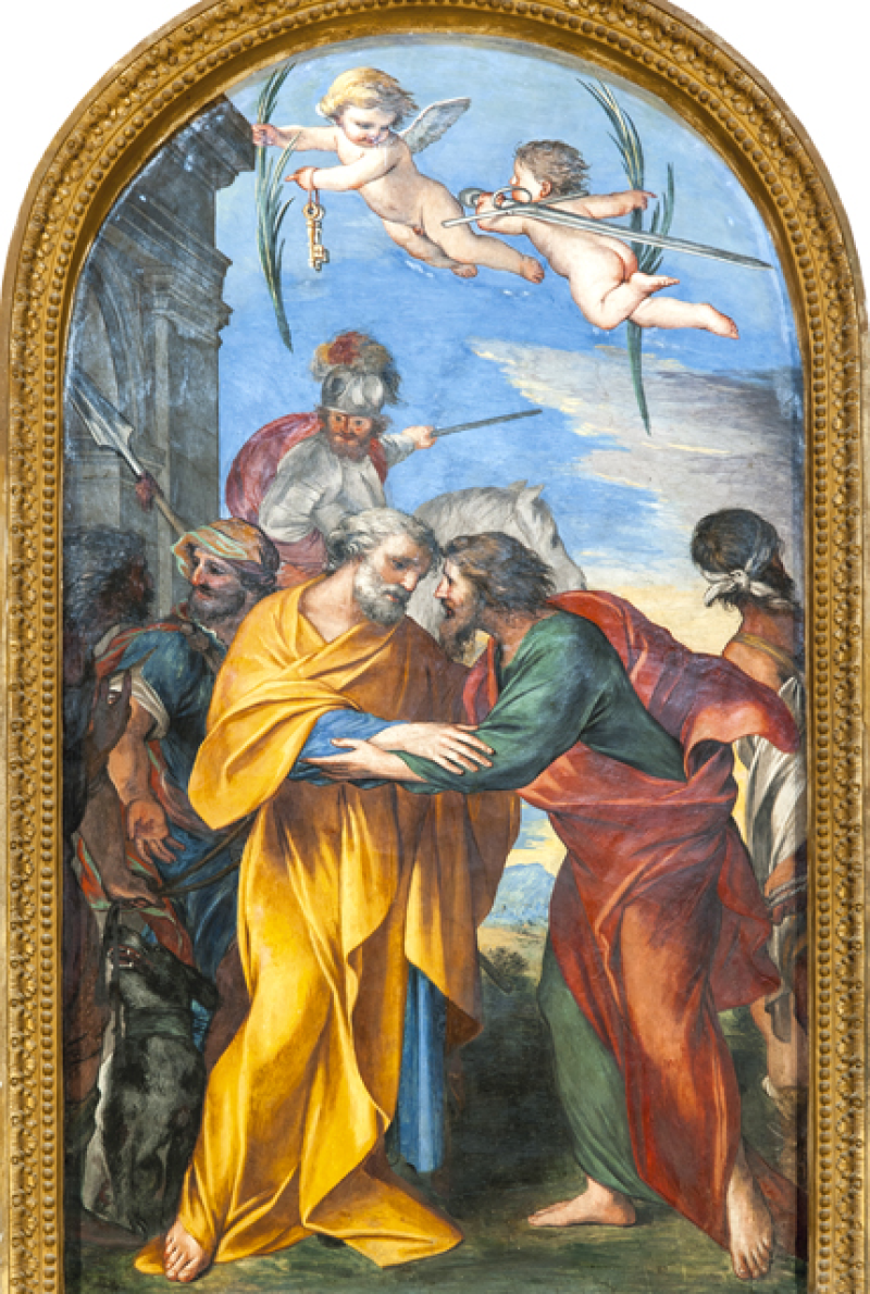 Nella cappella posta alla sinistra della porta di ingresso vi è una raffigurazione di Santa Rita da Cascia, di autore ignoto, cui si aggiunge una preziosa acquasantiera. Nel primo altare, un affresco raffigurante l’Incontro tra i SS Pietro e Paolo, è attribuibile a uno dei collaboratori di Salvi Castellucci. Nel secondo altare, la Madonna del Rosario con i Santi Domenico e Caterina da Siena, opera di Salvi Castellucci. Dietro l’altare maggiore si conserva una preziosa Trasfigurazione, opera di Giovanni Maria Colombi e dei suoi collaboratori. Vi sono inoltre conservati i candelieri donati da Fausto Poli, sul cui piedistallo è scolpito lo stemma gentilizio del cardinale e un bel paliotto con al centro il Crocifisso