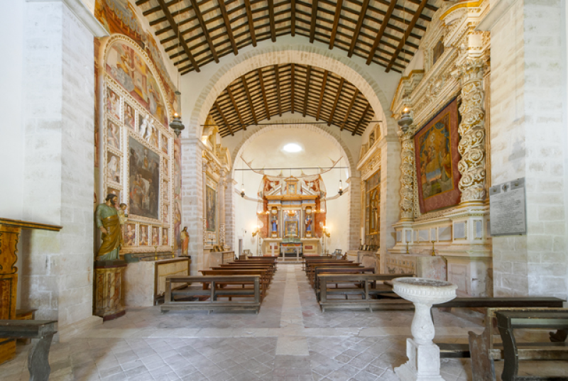 L`interno accoglie 5 altari in un unico ambiente absidato di sec. XV, coperto da capriate sorrette da arconi. Presbiterio della prima metà del sec. XIX. Sulla parete destra, altare di San Giuseppe con tela di Giuseppe Cesari detto Cavalier d`Arpino; vi sono rappresentati il Salvatore e i SS. Giovnni Battista, Giuseppe e Michele Arcangelo (metà sec. XVII).