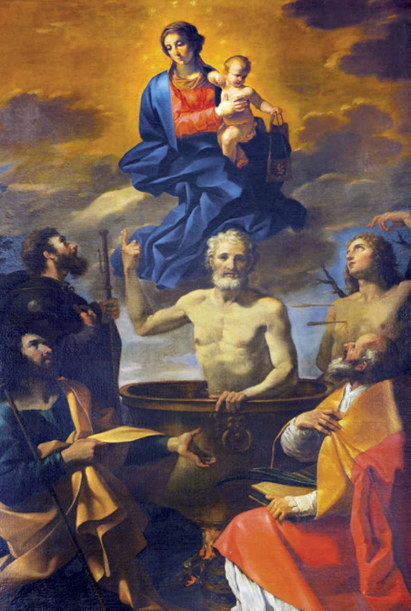La tela fu dipinta da Guidubaldo Abbatini, pittore del Palazzo Apostolico, grazie al generoso intervento del cardinale Fausto Poli da Usigni, il medesimo che fece aprire la strada che collegava le ferriere di Monteleone a Scheggino e s’adoprò perché venisse istituito il processo di beatificazione di Rita da Cascia. La grande tela, trasportata nel 1644 da un “mularo” locale di nome Andrea, raffigura la Vergine con Bambino e scapolare; sotto, S. Giovanni Evangelista sottoposto al supplizio dell’olio bollente, tra S. Rocco col bordone e la conchiglia di pellegrino a Compostela e S. Sebastiano, protettori dal flagello della peste nera, a quei tempi sempre incombente; in primo piano, a sinistra, S. Giacomo e, a destra, Papa Silvestro.