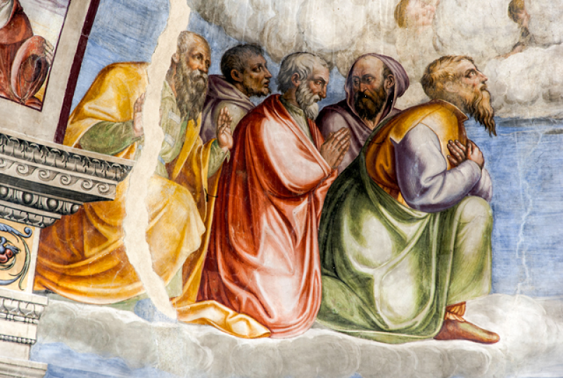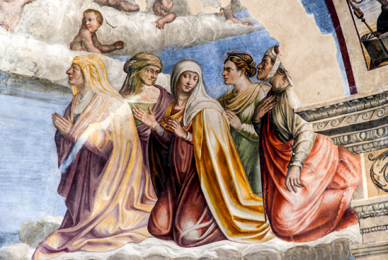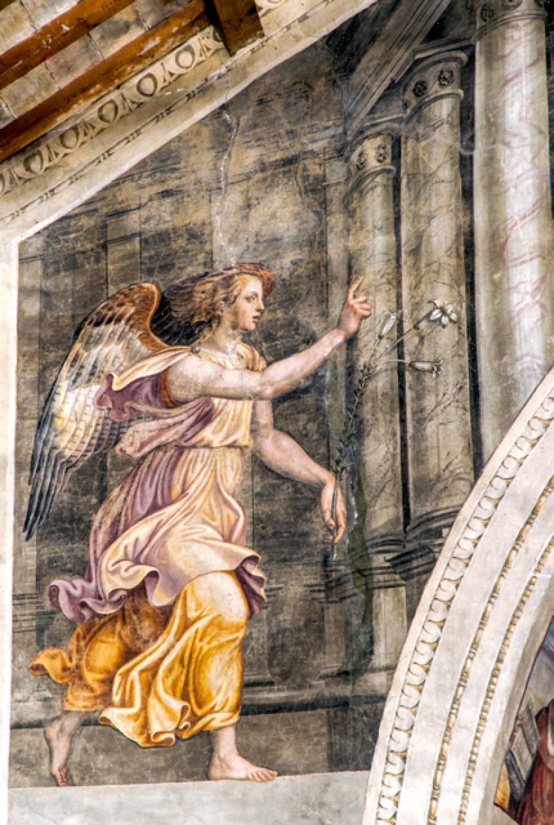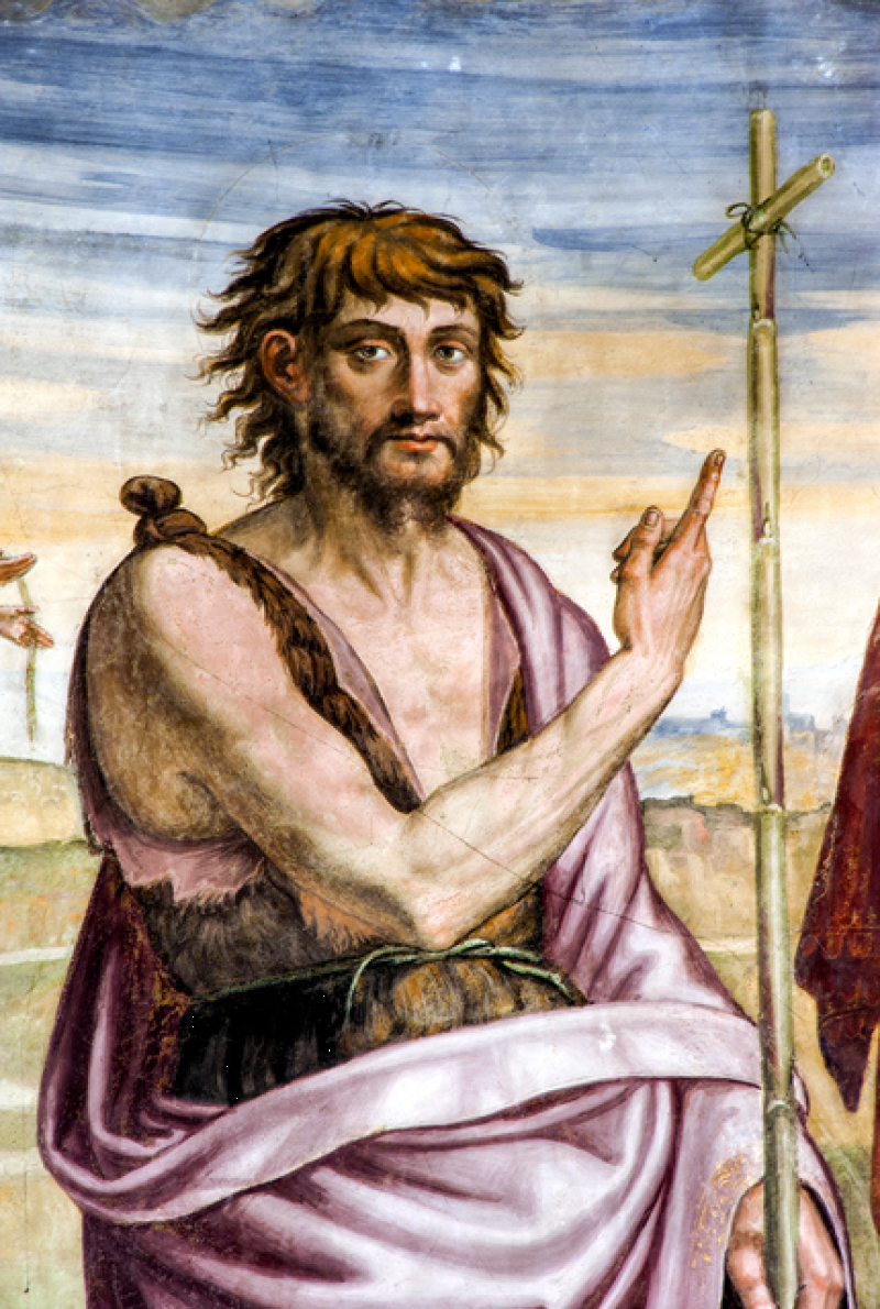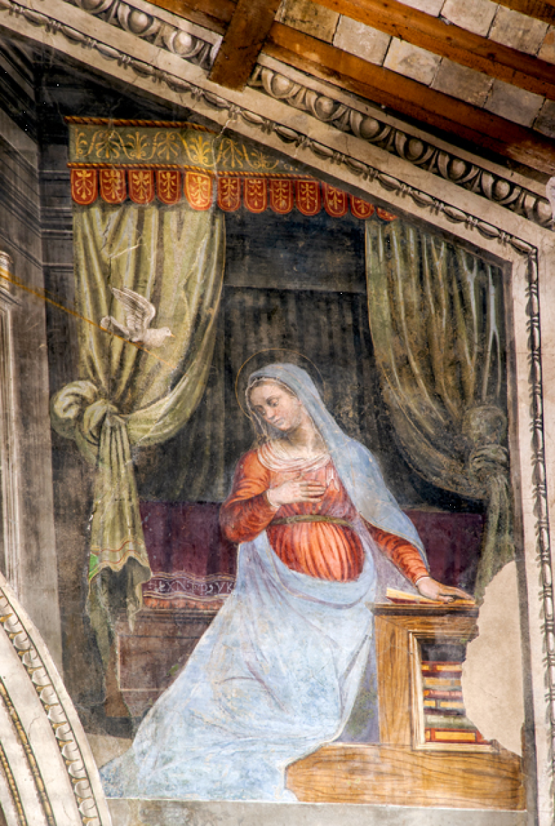 Nella conca, Morte e Incoronazione della Vergine, ispirati alle opere di Filippo Lippi visibili nell’abside del Duomo di Spoleto. Nel sottarco, il Battesimo di Cristo, Evangelisti e Dottori della Chiesa; sulla fronte dell`arco Annunciazione ed Eterno Padre; in basso a sinistra i SS Sebastiano e Rocco e a destra Angeli reggi-cortina (con stemma di Spoleto) ai lati di un tabernacolo in pietra datato 1504. Sul lato destro della navata, una nicchia dipinta scoperta nel 1975 mostra una Crocifissione della metà del sec. XVI. Il Fonte battesimale è in pietra locale e risale al sec. XVI.