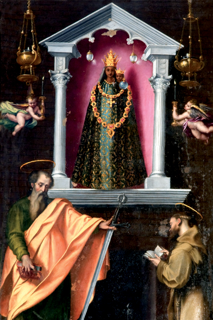In the 17th century, the interior was enriched by altars and canvases. On the high altar, is a large temple-shaped tabernacle held up by sphinxes similar to that of the collegiate church of Santa Maria in Cascia, work of Francesco Piergentili. Madonna with child, wood polychrome statue. Rich sacristy furnishings, including the reliquary of St. Giovenale (15th century) in gold-plated copper.