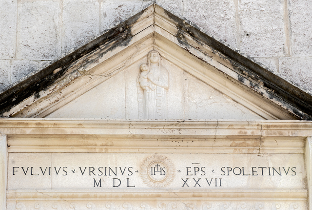 The gabled façade is in white stone. The Renaissance portal culminates with a tympanum and has pilasters and jambs decorated with classic motifs; in the lunette is a bas-relief Madonna and Child (the work of Lombard stoneworkers, dated 1577).