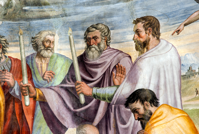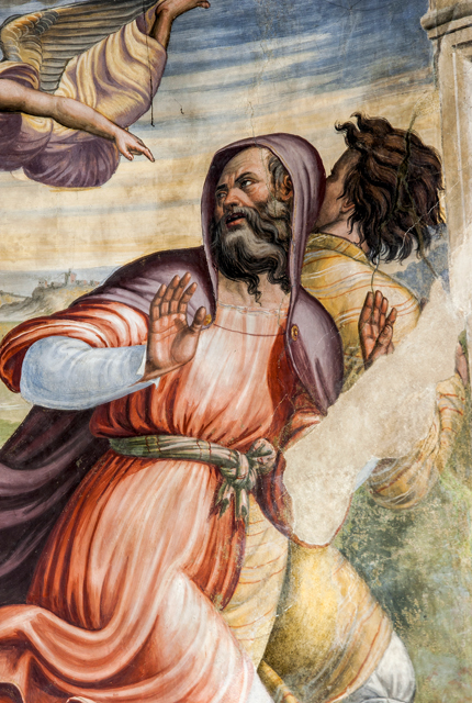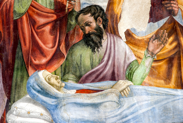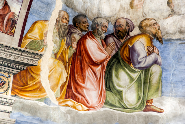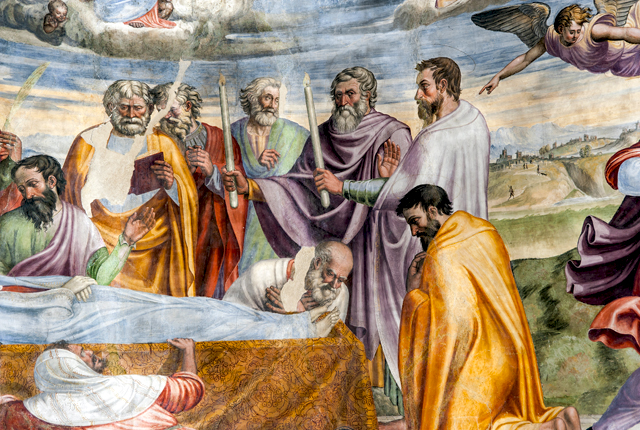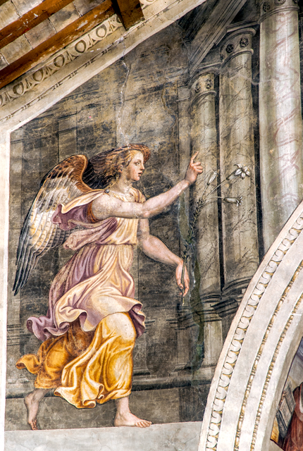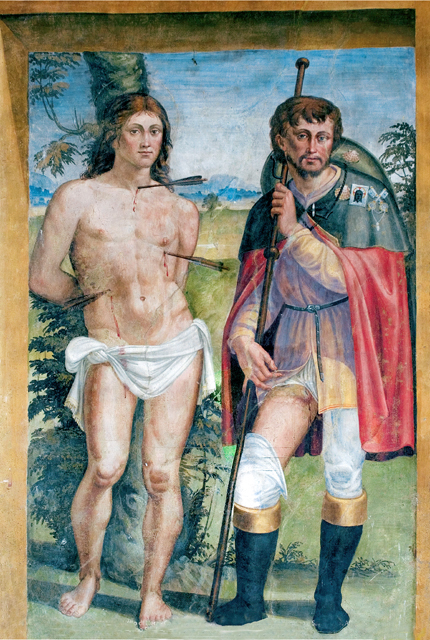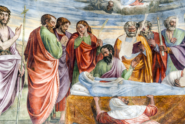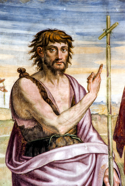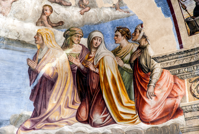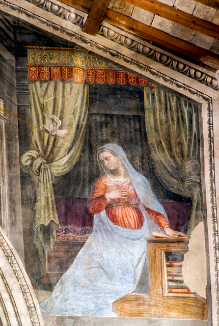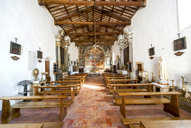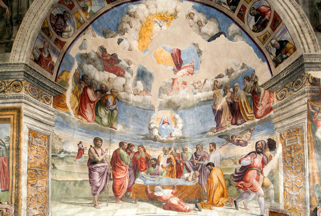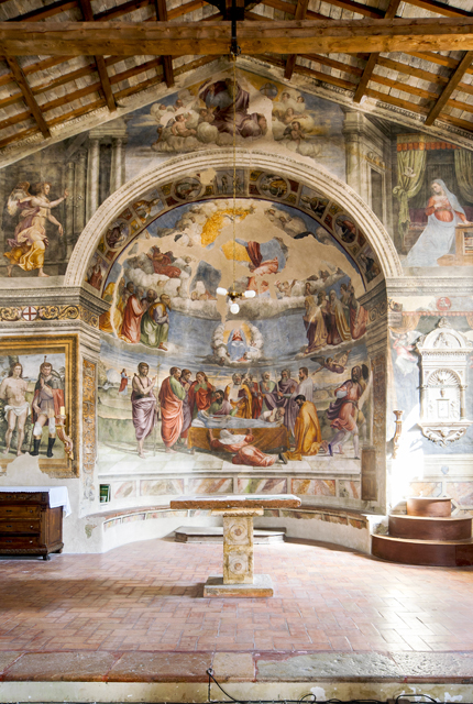 Inside, canvases of the 17th century with one altar in stucco and one altar in wood. The apse wall is entirely frescoed by Jacopo Siculo and is dated 1536. The conch holds the Death and Coronation of the Virgin, inspired by the works of Filippo Lippi in the apse of the Cathedral of Spoleto. In the transverse arch, the Baptism of Christ, Evangelists and Doctors of the Church; on the front of the arch, Annunciation and Eternal Father; bottom left, the Saints Sebastian and Rocco and, on the right, Angels curtain-holders (with the Spoleto coat of arms) at the sides of a tabernacle in stone from 1504.