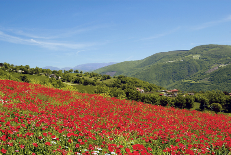 Meggiano sorge lungo l’antica via montana, a 769 m s.l.m. La struttura del paese si compone di tre elementi: un castello ellittico di pendio risalente al XIII – XIV secolo, del quale rimane la porta d’ingresso con visibili le feritoie (al tempo utilizzate per azionare il ponte levatoio), il borgo allineato lungo l’antica via d’ingresso al castello e l’area dove sorge la Chiesa di San Michele Arcangelo oggi attraversata dalla strada provinciale.