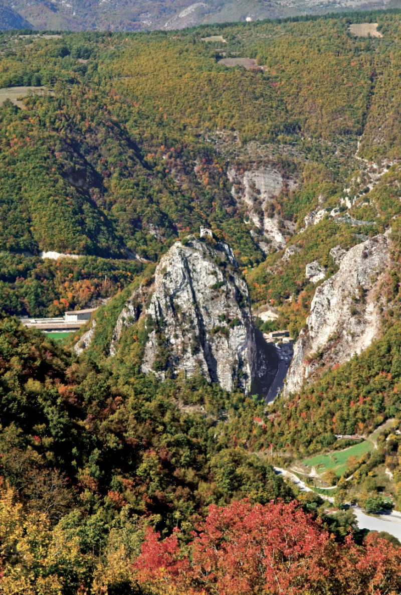 Lasciandosi Cascia alle spalle, in direzione di Roccaporena, si entra nella Valle del Fiume Corno. Dopo pochi chilometri, la gola s’allarga e si biforca al centro esatto della biforcazione del fiume Corno, s’innalza lo Scoglio Sacro di Roccaporena: piramide spoglia e biancastra la cui cima si perde nell’azzurro.